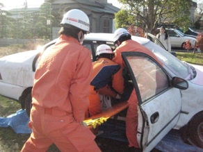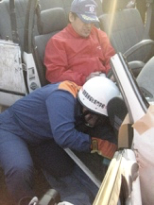 交通事故による車内救出訓練を指導しています。 |